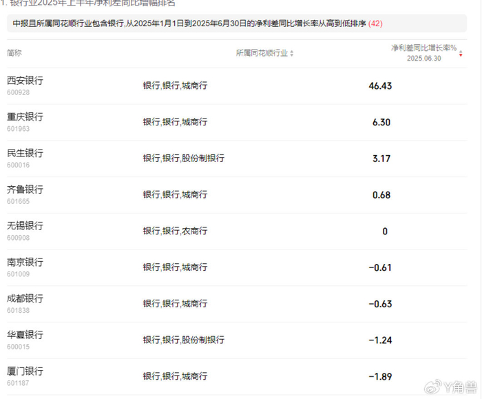 对多数银行来说,西安银行大幅飙升的净利差堪称“奇迹”。根据同花顺统计,A股42家上市银行业在2025年上半年的净息差同比增幅以负值为主,平均下降10个基点,平均净息差为1.42%,这一趋势与2024年的情况相似,当时42家A股上市银行的平均净息差为1.64%,较上年末下降了0.14个百分点。而净利差同比上升的仅有西安银行、重庆银行、齐鲁银行和民生银行四家,其他上市银行的净利差均为同比下降。