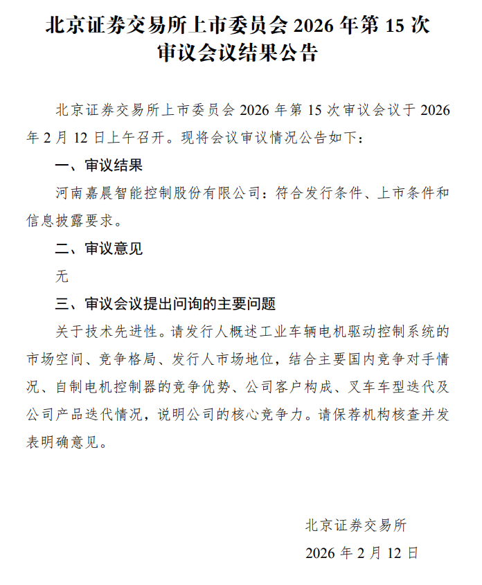 2月12日下午,北交所发布审核会议公告,河南嘉晨智能控制股份有限公司过会了。