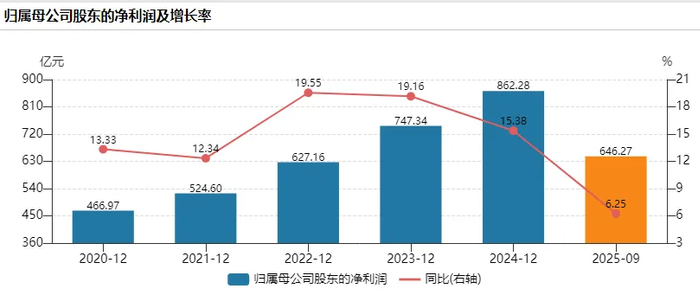 2020年,茅台的归母净利润为466.97亿,2024年已达862.28亿,今年前三季度已实现646.27亿,同样远超2020年全年。