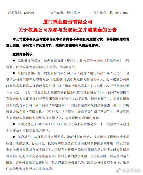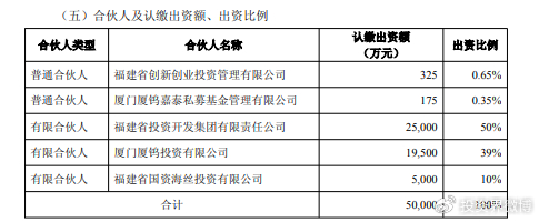 投资界-解码LP获悉,11月25日,厦门钨业公告,公司全资子公司厦门厦钨投资有限公司拟出资1.95亿元作为有限合伙人,公司权属公司厦门厦钨嘉泰私募基金管理有限公司(简称“厦钨嘉泰”)拟出资175万元作为普通合伙人之一,与另一普通合伙人福建省创新创业投资管理有限公司(简称“福创投”),有限合伙人福建省投资开发集团有限责任公司(简称“福建省投”)、福建省国资海丝投资有限公司(简称“福建海丝”)共同发起设立福创嘉泰益鑫(厦门)并购投资合伙企业(有限合伙),基金管理人为福创投,基金规模为5亿元。