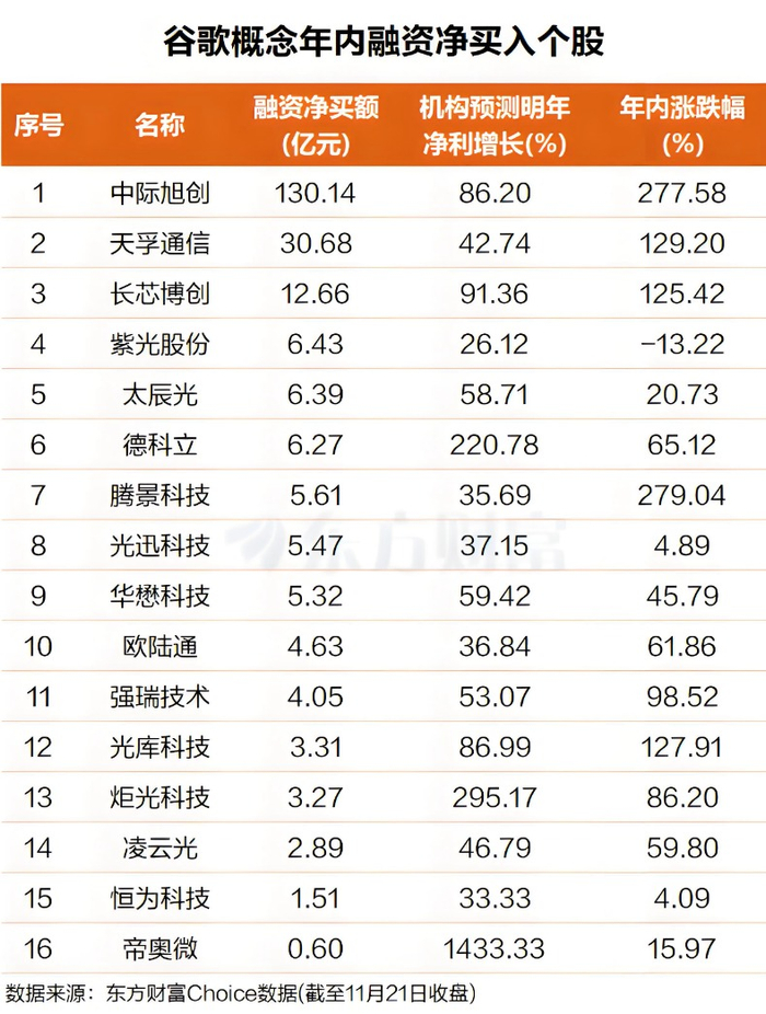 其中光模块龙头中际旭创排名第一,年内至今融资净买额超130亿元,机构预测明年净利润增长超86%;天孚通信排名第二,融资净买额超30亿元,机构预测明年净利润增长超42%。