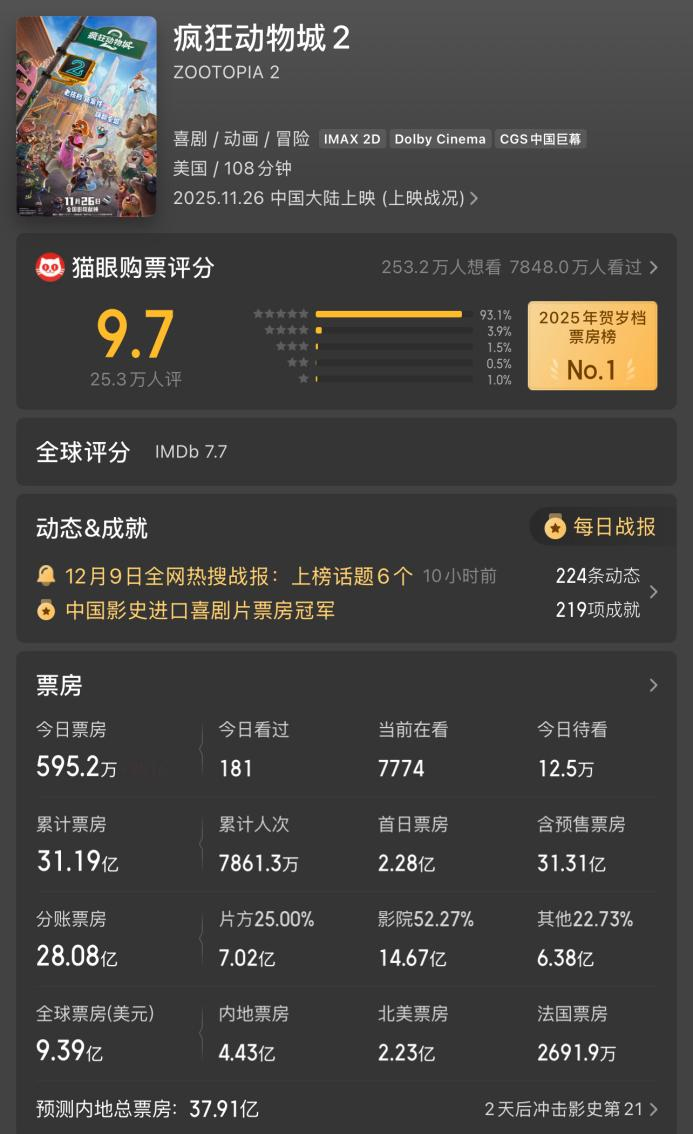 《疯狂动物城2》方面,朱迪与尼克的回归引爆全球观影狂潮,影片一经上映便口碑爆棚,取得了猫眼9.7、淘票票9.7、豆瓣8.7以及烂番茄新鲜度93%、爆米花指数95%的惊艳开画成绩。