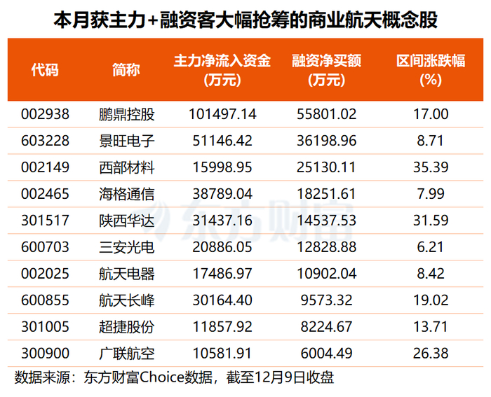 东方财富Choice数据显示,12月以来,共有91只商业航天概念股获融资净买入,其中净买额超5000万元的有33股,航天发展、鹏鼎控股、航天电子、上海瀚讯融资净买额均超4亿元。