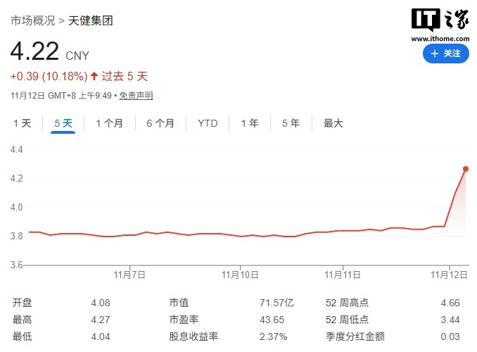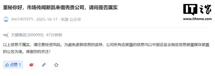 【股价一度涨停,#天健集团否认新凯来借壳传闻#】11 月 12 日消息,今日早间有传闻称新凯来“借壳”天健集团进行上市。新凯来为深圳国资控制的企业,天健集团也是深圳国资旗下的地产上市公司,因此给了市场一定想象空间。针对这一传闻,天健集团回应投资者称信息不属实,请注意投资风险。为避免虚假信息的误导,公司所有应披露的信息均以中国证监会指定信息披露媒体披露的公告为准。受早间传闻影响,天健集团股价在今天开盘后暴力拉升,甚至一度涨停。截至IT之家发稿,天健集团股价涨幅已经回落至 8% 左右。