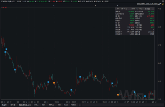 2023年8月1日以55.68元/股的发行价上市,当日其股价一度冲高至80.04元/股(不复权),创下历史最高点。当日报收于70.7元,对应市值约282.86亿元。