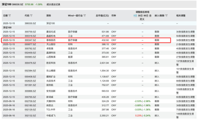 国内临床CRO龙头企业泰格医药(300347.SZ)于12月15日起正式被调出深证100成份股,结束了自2019年12月纳入以来长达六年的指数生涯。此次调整正值CRO行业因“猴荒”再现迎来普涨行情,板块内多数企业股价上行。