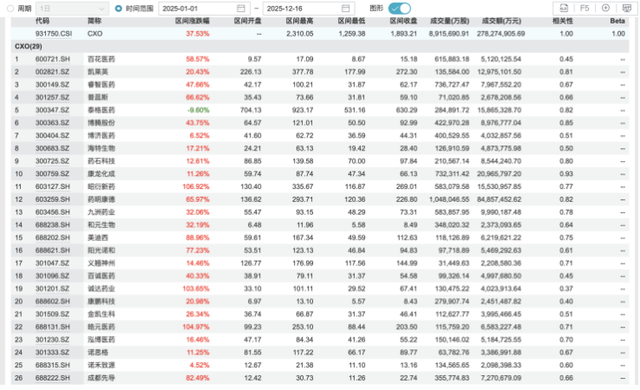 Wind数据显示,2025年以来,在CXO指数(931750.CS)与CRO指数(8841421.WI)29只、23只成份股中,泰格医药(300347.SZ)是唯一录得下跌的企业,截至12月16日累计跌幅达9.60%,市值较高点蒸发逾1300亿元,目前已回落至400亿梯队。