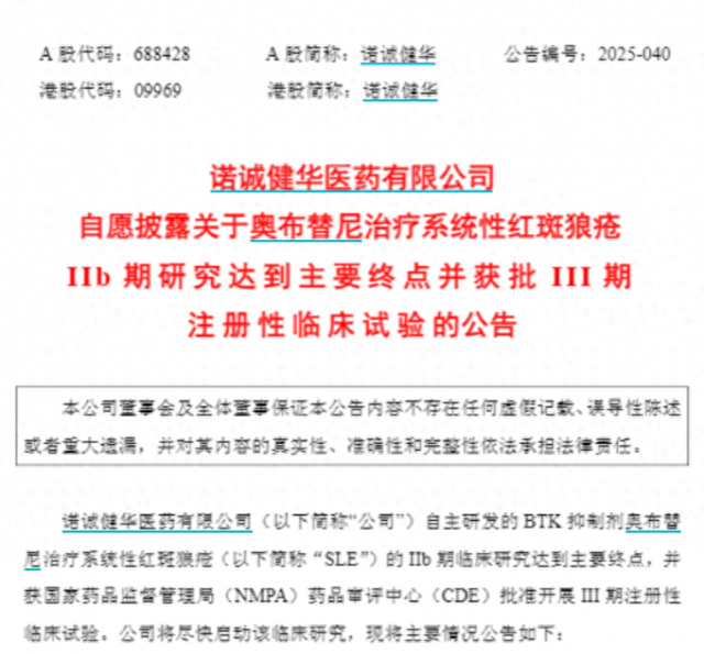 12月15日,生物医药公司诺诚健华宣布,其核心产品奥布替尼用于治疗系统性红斑狼疮(SLE)的IIb期临床研究达到主要终点,并已获国家药品监督管理局批准开展Ⅲ期临床试验。
