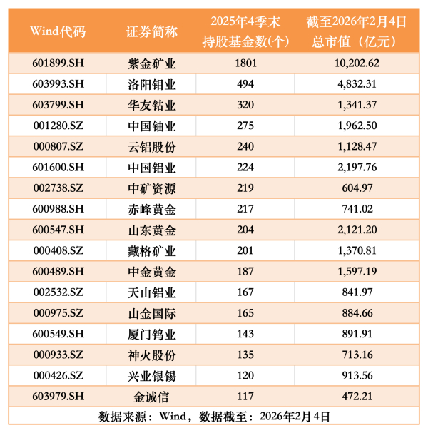 其中,“一超”格局尤为突出。总市值高达1.02万亿的行业绝对龙头紫金矿业,在2025年末被约1801只基金持有,其持仓基金数量在板块内断崖式领先,形成了孤峰般的存在。排名第二的洛阳钼业,总市值超4832亿元,被约494只基金持有,不到紫金矿业的三分之一。紧随其后的华友钴业、云铝股份、中国铝业、中矿资源、赤峰黄金、山东黄金等,这些公司的总市值绝大多数位于600亿元以上。