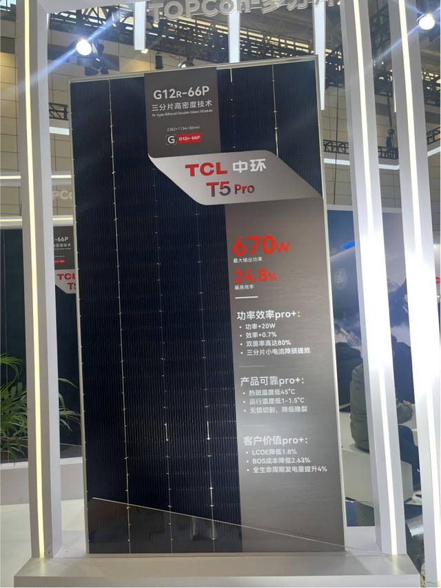 TCL中环也带来了三分片高密度技术组件,产品性能有所提升,功率较前代产品提升20W,度电成本(LCOE)降低1.8%,系统平衡成本(BOS)降低2.63%,全生命周期发电量提升4%,进一步凸显多分片技术的商业化价值。