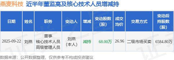 证券之星消息,根据9月25日市场公开信息、上市公司公告及交易所披露数据整理,燕麦科技(688312)最新董监高及相关人员股份变动情况:2025年9月22日公司董事,核心技术人员,高级管理人员刘燕共减持公司股份68.0万股,占公司总股本为0.4665%。变动期间公司股价上涨8.48%,9月22日当日收盘报32.5元。