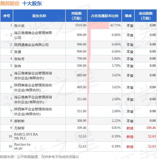 根据美邦股份2025年中报公布的十大股东详情如下: