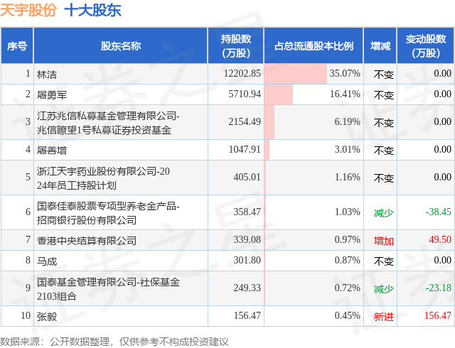 根据天宇股份2025年中报公布的十大股东详情如下: