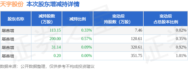 证券之星消息,10月15日天宇股份发布公告《天宇股份:关于控股股东、实际控制人之一致行动人减持股份触及1%整数倍暨减持计划实施完成的公告》,其股东屠善增于2025年10月10日至2025年10月15日间合计减持344.49万股,占公司目前总股本的0.9901%,变动期间该股股价下跌4.44%,截止10月15日收盘报24.54元。