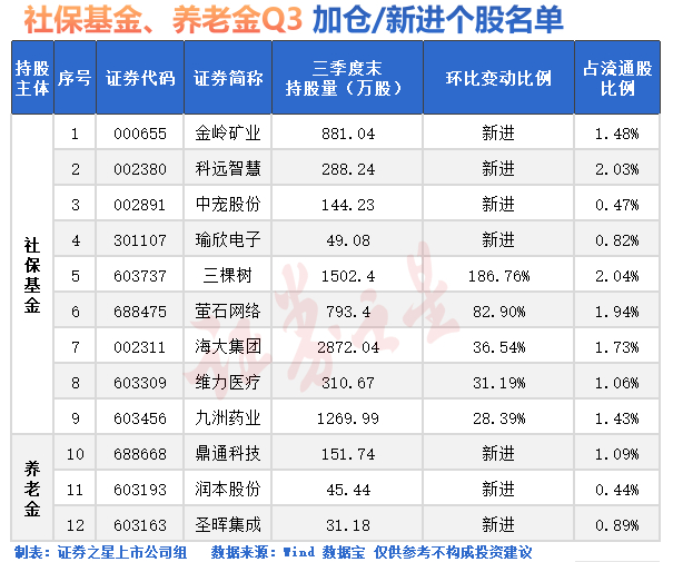 从第三季度加仓变动幅度看,金岭矿业、科远智慧、中宠股份、瑜欣电子等4只个股获社保基金最新建仓;三棵树第三季度获社保基金持股量翻倍增长,增幅达186.76%;萤石网络、海大集团、维力医疗、九洲药业等4只股三季度也获社保基金加仓,幅度在28%至82%不等。