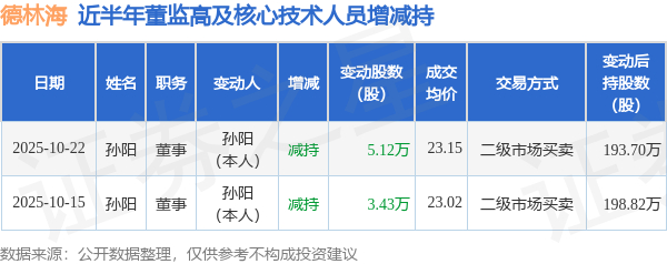 德林海近半年内的董监高及核心技术人员增减持详情如下: