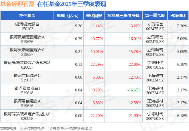 证券之星消息,截止2025年三季度末,基金经理石磊旗下共管理8只基金,本季度表现最佳的为银河高端装备混合发起式A(020057),季度净值涨22.08%。