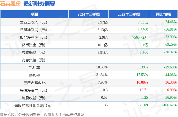 据证券之星公开数据整理,近期石英股份(603688)发布2025年三季报。截至本报告期末,公司营业总收入7.53亿元,同比下降24.46%,归母净利润1.35亿元,同比下降56.81%。按单季度数据看,第三季度营业总收入2.38亿元,同比下降8.43%,第三季度归母净利润2831.32万元,同比下降49.48%。本报告期石英股份三费占比上升明显,财务费用、销售费用和管理费用总和占总营收同比增幅达36.3%。