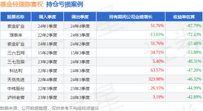陈富权管理的农银平衡双利混合基金在24年1季度买入紫金矿业,在持有3个季度后在24年4季度卖出。持有期间的估算收益率为-87.79%,持有期间紫金矿业在2023年到2024年的年报归属净利润增幅达51.76%。