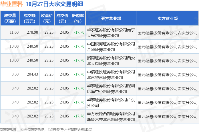 证券之星消息,10月27日华业香料发生大宗交易,交易数据如下: