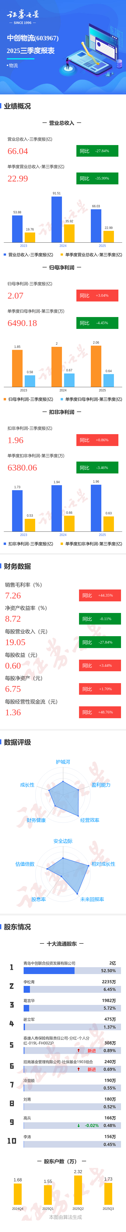 证券之星消息,中创物流2025年三季报显示,公司主营收入66.04亿元,同比下降27.84%;归母净利润2.07亿元,同比上升3.05%;扣非净利润1.96亿元,同比上升0.87%;其中2025年第三季度,公司单季度主营收入22.99亿元,同比下降35.99%;单季度归母净利润6490.18万元,同比下降4.46%;单季度扣非净利润6380.06万元,同比下降3.46%;负债率37.84%,投资收益2359.8万元,财务费用2039.06万元,毛利率7.26%。