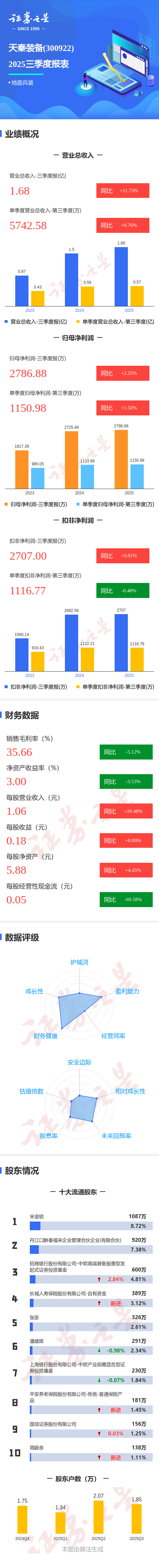 证券之星消息,天秦装备2025年三季报显示,公司主营收入1.68亿元,同比上升11.73%;归母净利润2786.88万元,同比上升2.25%;扣非净利润2707.0万元,同比上升0.91%;其中2025年第三季度,公司单季度主营收入5742.58万元,同比上升0.77%;单季度归母净利润1150.98万元,同比上升1.51%;单季度扣非净利润1116.77万元,同比下降0.49%;负债率10.87%,投资收益48.07万元,财务费用-636.98万元,毛利率35.66%。