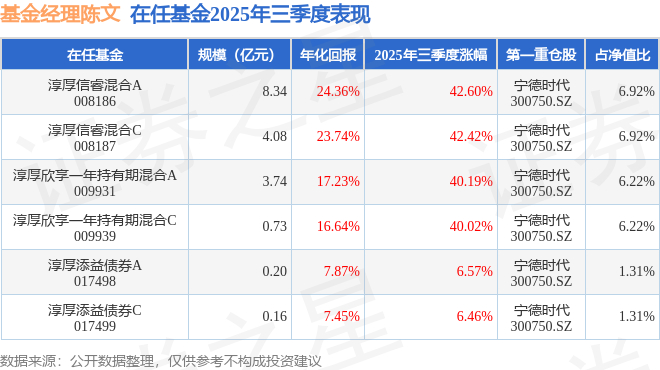 陈文管理的淳厚欣享一年持有期混合A基金在20年4季度买入永兴材料,在持有1个季度后在21年1季度卖出。持有期间的估算收益率为69.44%,持有期间永兴材料在2020年到2021年的年报归属净利润增幅达243.83%。