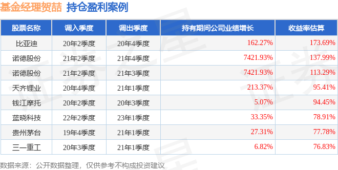 贺喆管理的华宝制造股票基金在20年2季度买入比亚迪,在持有2个季度后在20年4季度卖出。持有期间的估算收益率为173.69%,持有期间比亚迪在2019年到2020年的年报归属净利润增幅达162.27%。