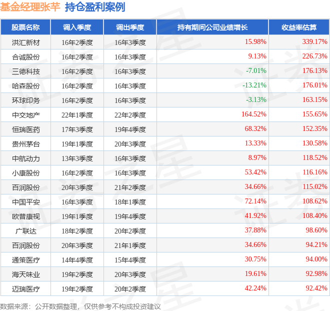 张芊管理的广发鑫裕混合A基金在16年2季度买入洪汇新材,在持有1个季度后在16年3季度卖出。持有期间的估算收益率为339.17%,持有期间洪汇新材在2015年到2016年的年报归属净利润增幅达15.98%。