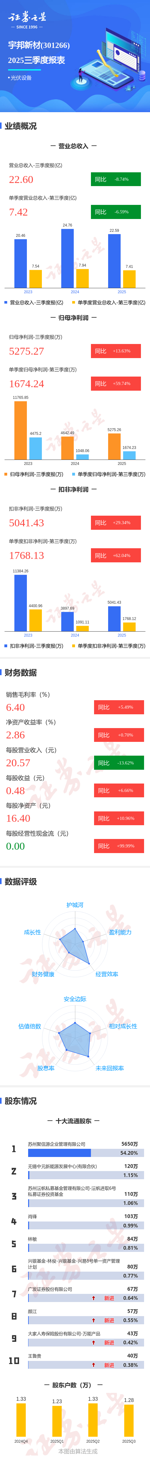 证券之星消息,宇邦新材2025年三季报显示,公司主营收入22.6亿元,同比下降8.75%;归母净利润5275.27万元,同比上升13.63%;扣非净利润5041.43万元,同比上升29.34%;其中2025年第三季度,公司单季度主营收入7.42亿元,同比下降6.59%;单季度归母净利润1674.24万元,同比上升59.75%;单季度扣非净利润1768.13万元,同比上升62.05%;负债率44.69%,投资收益-116.11万元,财务费用2571.26万元,毛利率6.4%。