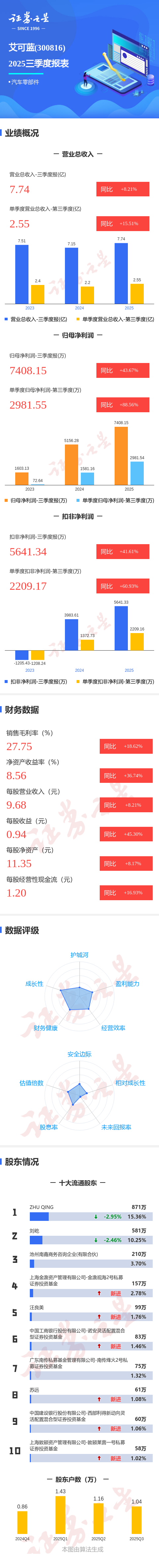 证券之星消息,艾可蓝2025年三季报显示,公司主营收入7.74亿元,同比上升8.21%;归母净利润7408.15万元,同比上升43.67%;扣非净利润5641.34万元,同比上升41.61%;其中2025年第三季度,公司单季度主营收入2.55亿元,同比上升15.51%;单季度归母净利润2981.55万元,同比上升88.57%;单季度扣非净利润2209.17万元,同比上升60.93%;负债率60.77%,投资收益452.47万元,财务费用2118.8万元,毛利率27.75%。