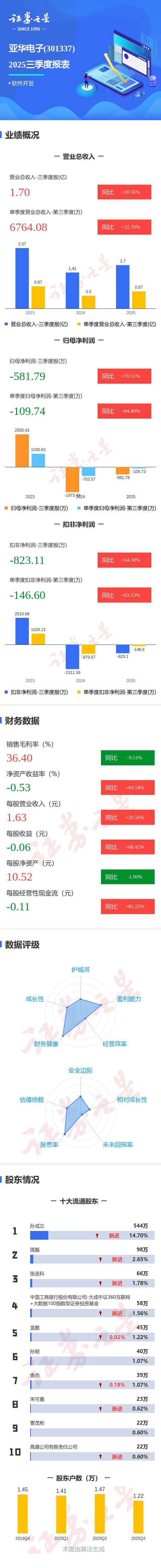 证券之星消息,亚华电子2025年三季报显示,前三季度公司主营收入1.7亿元,同比上升20.57%;归母净利润-581.79万元,同比上升70.52%;扣非净利润-823.11万元,同比上升64.39%;其中2025年第三季度,公司单季度主营收入6764.08万元,同比上升32.7%;单季度归母净利润-109.74万元,同比上升84.4%;单季度扣非净利润-146.6万元,同比上升83.33%;负债率11.88%,投资收益182.45万元,财务费用-612.29万元,毛利率36.4%。