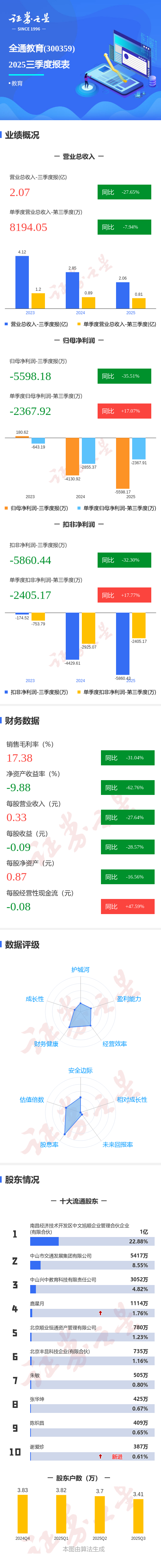 证券之星消息,全通教育2025年三季报显示,前三季度公司主营收入2.07亿元,同比下降27.65%;归母净利润-5598.18万元,同比下降35.52%;扣非净利润-5860.44万元,同比下降32.3%;其中2025年第三季度,公司单季度主营收入8194.05万元,同比下降7.95%;单季度归母净利润-2367.92万元,同比上升17.07%;单季度扣非净利润-2405.17万元,同比上升17.77%;负债率18.86%,投资收益-453.09万元,财务费用-215.86万元,毛利率17.38%。