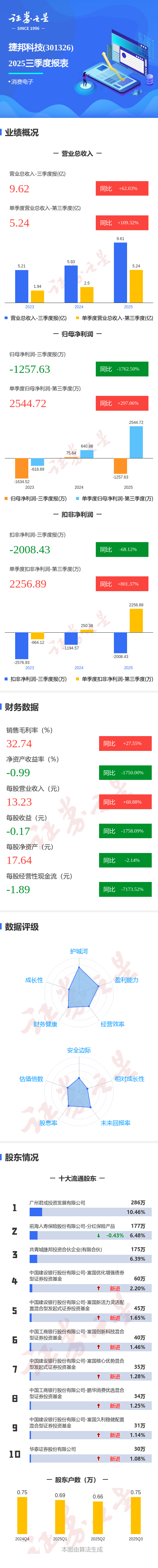 证券之星消息,捷邦科技2025年三季报显示,前三季度公司主营收入9.62亿元,同比上升62.04%;归母净利润-1257.63万元,同比下降1762.51%;扣非净利润-2008.43万元,同比下降68.13%;其中2025年第三季度,公司单季度主营收入5.24亿元,同比上升109.33%;单季度归母净利润2544.72万元,同比上升297.06%;单季度扣非净利润2256.89万元,同比上升801.37%;负债率46.93%,投资收益202.96万元,财务费用1124.3万元,毛利率32.74%。