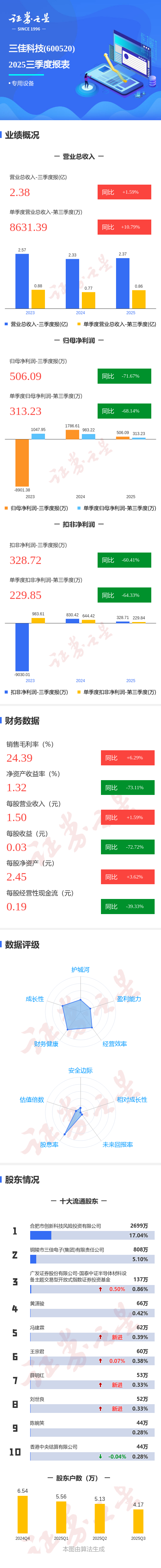 证券之星消息,三佳科技2025年三季报显示,前三季度公司主营收入2.38亿元,同比上升1.6%;归母净利润506.09万元,同比下降71.67%;扣非净利润328.72万元,同比下降60.42%;其中2025年第三季度,公司单季度主营收入8631.39万元,同比上升10.79%;单季度归母净利润313.23万元,同比下降68.14%;单季度扣非净利润229.85万元,同比下降64.33%;负债率49.53%,投资收益36.59万元,财务费用-180.77万元,毛利率24.39%。