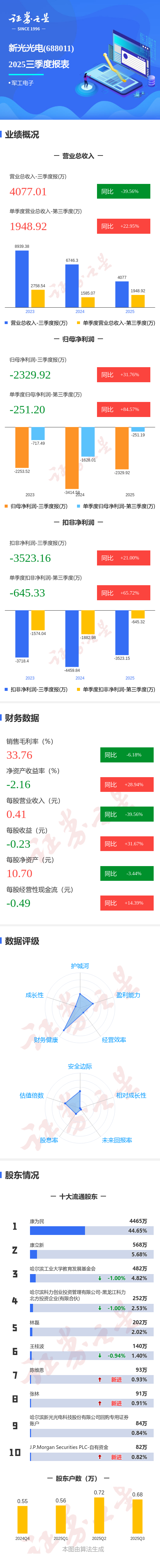 证券之星消息,新光光电2025年三季报显示,前三季度公司主营收入4077.01万元,同比下降39.57%;归母净利润-2329.92万元,同比上升31.77%;扣非净利润-3523.16万元,同比上升21.0%;其中2025年第三季度,公司单季度主营收入1948.92万元,同比上升22.95%;单季度归母净利润-251.2万元,同比上升84.57%;单季度扣非净利润-645.33万元,同比上升65.73%;负债率13.22%,投资收益728.36万元,财务费用-36.07万元,毛利率33.76%。