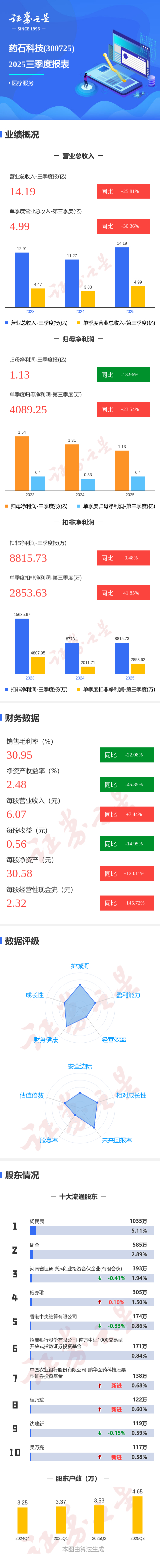 证券之星消息,药石科技2025年三季报显示,前三季度公司主营收入14.19亿元,同比上升25.81%;归母净利润1.13亿元,同比下降13.96%;扣非净利润8815.73万元,同比上升0.49%;其中2025年第三季度,公司单季度主营收入4.99亿元,同比上升30.36%;单季度归母净利润4089.25万元,同比上升23.54%;单季度扣非净利润2853.63万元,同比上升41.85%;负债率8.28%,投资收益2164.27万元,财务费用2563.18万元,毛利率30.95%。