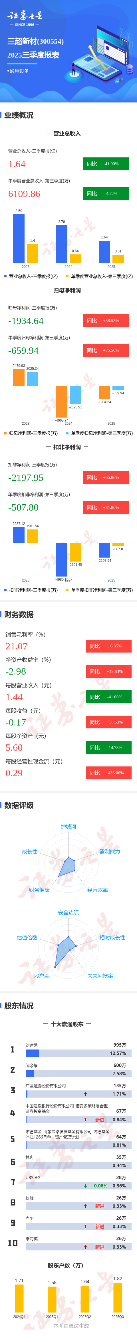 证券之星消息,三超新材2025年三季报显示,前三季度公司主营收入1.64亿元,同比下降41.0%;归母净利润-1934.64万元,同比上升58.54%;扣非净利润-2197.95万元,同比上升55.87%;其中2025年第三季度,公司单季度主营收入6109.86万元,同比下降4.73%;单季度归母净利润-659.94万元,同比上升75.5%;单季度扣非净利润-507.8万元,同比上升81.81%;负债率28.68%,投资收益52.18万元,财务费用287.77万元,毛利率21.07%。