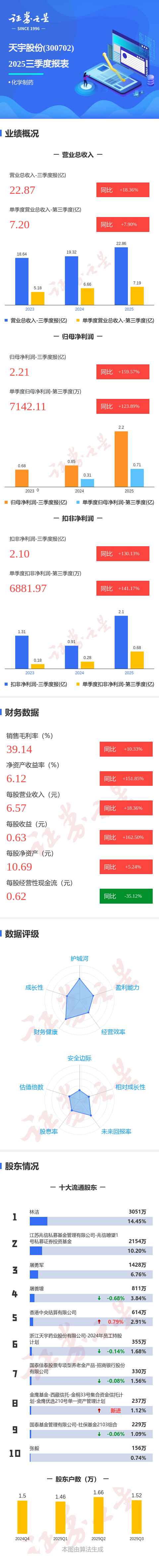 证券之星消息,天宇股份2025年三季报显示,前三季度公司主营收入22.87亿元,同比上升18.36%;归母净利润2.21亿元,同比上升159.57%;扣非净利润2.1亿元,同比上升130.13%;其中2025年第三季度,公司单季度主营收入7.2亿元,同比上升7.91%;单季度归母净利润7142.11万元,同比上升123.9%;单季度扣非净利润6881.97万元,同比上升141.18%;负债率43.32%,投资收益-18.24万元,财务费用2428.62万元,毛利率39.14%。