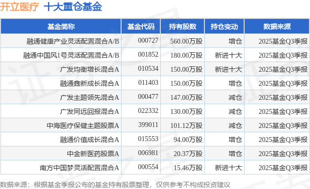 根据2025基金Q3季报公募基金重仓股数据,重仓该股的公募基金共21家,其中持有数量最多的公募基金为融通基金的融通健康产业灵活配置混合A/B。融通健康产业灵活配置混合A/B目前规模为18.16亿元,最新净值2.782(10月29日),较上一交易日下跌1.31%,近一年上涨9.23%。该公募基金现任基金经理为万民远。万民远在任的基金产品包括:融通鑫新成长混合A,管理时间为2021年10月8日至今,期间收益率为34.61%;融通价值成长混合A,管理时间为2022年7月18日至今,期间收益率为28.13%;融通医疗保健行业混合A/B,管理时间为2023年3月15日至今,期间收益率为-18.88%。