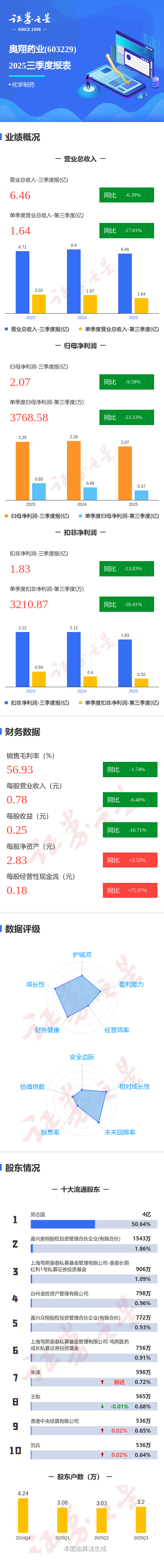 证券之星消息,奥翔药业2025年三季报显示,前三季度公司主营收入6.46亿元,同比下降6.4%;归母净利润2.07亿元,同比下降9.59%;扣非净利润1.83亿元,同比下降13.83%;其中2025年第三季度,公司单季度主营收入1.64亿元,同比下降17.01%;单季度归母净利润3768.58万元,同比下降23.33%;单季度扣非净利润3210.87万元,同比下降20.42%;负债率23.3%,投资收益1924.35万元,财务费用-429.16万元,毛利率56.93%。