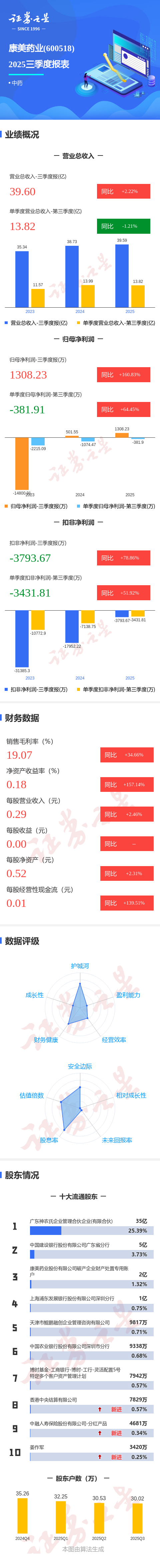 证券之星消息,康美药业2025年三季报显示,前三季度公司主营收入39.6亿元,同比上升2.22%;归母净利润1308.23万元,同比上升160.84%;扣非净利润-3793.67万元,同比上升78.87%;其中2025年第三季度,公司单季度主营收入13.82亿元,同比下降1.22%;单季度归母净利润-381.91万元,同比上升64.46%;单季度扣非净利润-3431.81万元,同比上升51.93%;负债率47.2%,投资收益2736.74万元,财务费用52.64万元,毛利率19.07%。