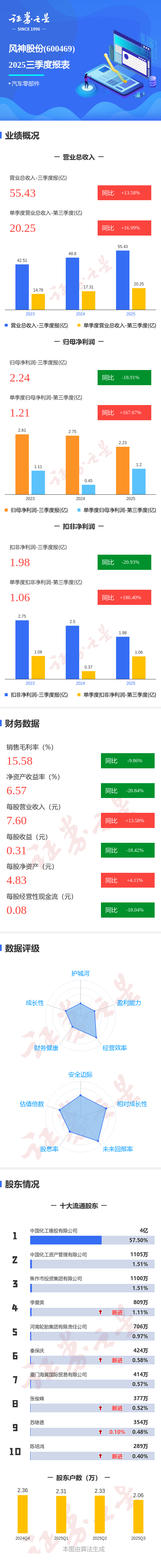 证券之星消息,风神股份2025年三季报显示,前三季度公司主营收入55.43亿元,同比上升13.58%;归母净利润2.24亿元,同比下降18.91%;扣非净利润1.98亿元,同比下降20.94%;其中2025年第三季度,公司单季度主营收入20.25亿元,同比上升17.0%;单季度归母净利润1.21亿元,同比上升167.67%;单季度扣非净利润1.06亿元,同比上升186.4%;负债率55.07%,投资收益-5329.63万元,财务费用11.33万元,毛利率15.58%。