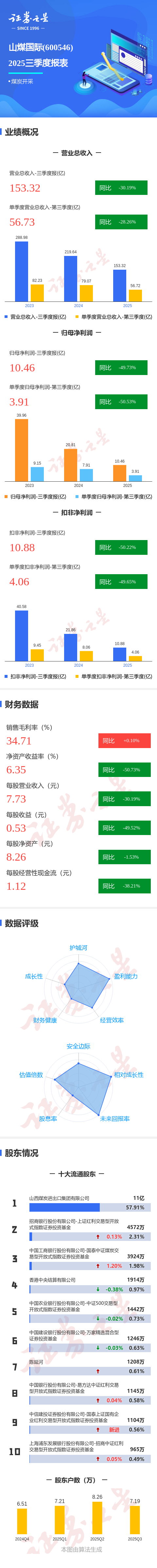 证券之星消息,山煤国际2025年三季报显示,前三季度公司主营收入153.32亿元,同比下降30.2%;归母净利润10.46亿元,同比下降49.74%;扣非净利润10.88亿元,同比下降50.23%;其中2025年第三季度,公司单季度主营收入56.73亿元,同比下降28.27%;单季度归母净利润3.91亿元,同比下降50.53%;单季度扣非净利润4.06亿元,同比下降49.65%;负债率49.71%,投资收益4219.74万元,财务费用1.56亿元,毛利率34.71%。