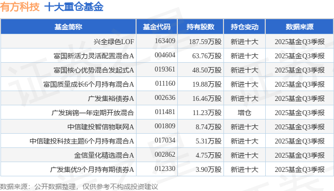 持有有方科技最多的基金为兴全绿色LOF,目前规模为25.35亿元,最新净值1.46(10月30日),较上一交易日下跌0.48%,近一年上涨30.52%。该基金现任基金经理为邹欣。