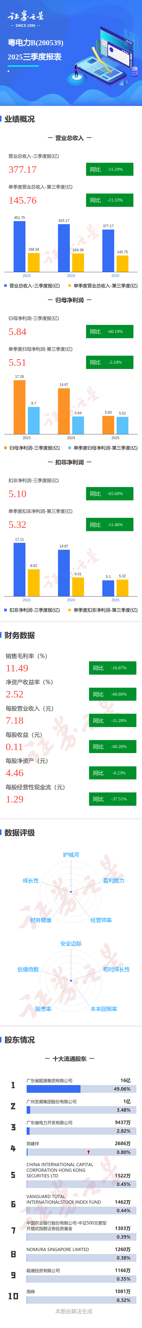 证券之星消息,粤电力B2025年三季报显示,前三季度公司主营收入377.17亿元,同比下降11.29%;归母净利润5.84亿元,同比下降60.2%;扣非净利润5.1亿元,同比下降65.68%;其中2025年第三季度,公司单季度主营收入145.76亿元,同比下降11.33%;单季度归母净利润5.51亿元,同比下降2.25%;单季度扣非净利润5.32亿元,同比下降11.46%;负债率79.45%,投资收益6.11亿元,财务费用16.57亿元,毛利率11.49%。