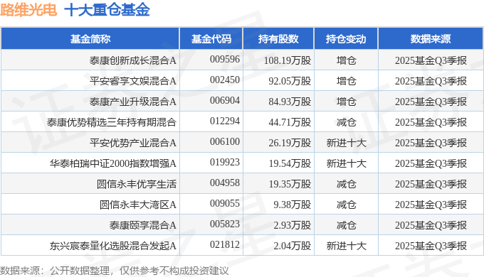 持有路维光电最多的基金为泰康创新成长混合A,目前规模为8.12亿元,最新净值1.3073(10月31日),较上一交易日下跌3.59%,近一年上涨47.68%。该基金现任基金经理为薛小波。