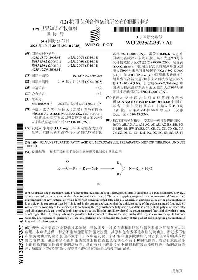 证券之星消息,根据企查查数据显示嘉必优(688089)公布了一项国际专利申请,专利名为“一种多不饱和脂肪酸油脂微胶囊及其制备方法和应用”,专利申请号为PCT/CN2025/090253,国际公布日为2025年10月30日。