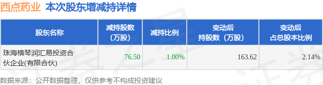 证券之星消息,11月3日西点药业发布公告《西点药业:简式权益变动报告书》,其股东珠海横琴润汇易投资合伙企业(有限合伙)于2025年10月28日至2025年11月3日间合计减持76.5万股,占公司目前总股本的1.0001%,变动期间该股股价下跌2.79%,截止11月3日收盘报30.98元。