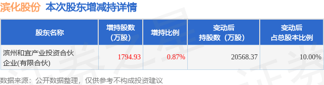 证券之星消息,11月4日滨化股份发布公告《滨化股份:滨化股份简式权益变动报告书(和宜投资)》,其股东滨州和宜产业投资合伙企业(有限合伙)于2025年9月3日至2025年11月4日间合计增持1794.93万股,占公司目前总股本的0.8727%,变动期间该股股价上涨2.4%,截止11月4日收盘报4.27元。